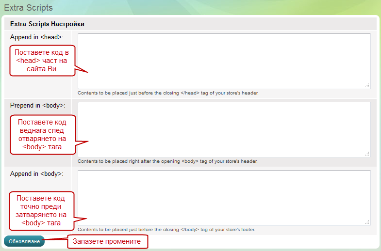 След като добавите желаният от Вас код просто трябва да натиснете бутона "Обновяване", за да запазите направените от Вас промени.