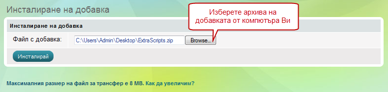 След това трябва да изберете архива на добавката от компютъра Ви, за да го качите. След като изберете архива от компютъра Ви натиснете върху бутона "Инсталирай".
