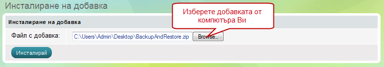 След това трябва да изберете архива на добавката от компютъра Ви, за да го качите. След като изберете архива от компютъра Ви натиснете върху бутона "Инсталирай".