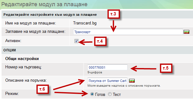 Трябва да поставите текст, който да служи за описание на поръчките, които клиентите правят чрез модула на Transcard. Това описание се въвежда по ваше усмотрение, например "Поръчка през www.моя-сайт.bg". За режим, изберете "Готов", за да работи модула за клиентите.