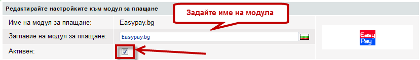 Сложете име на модула, което ще излиза в клиентската област на магазина ви, когато клиентите избират как да платят. Поставете и отметка, че модулът е активен.