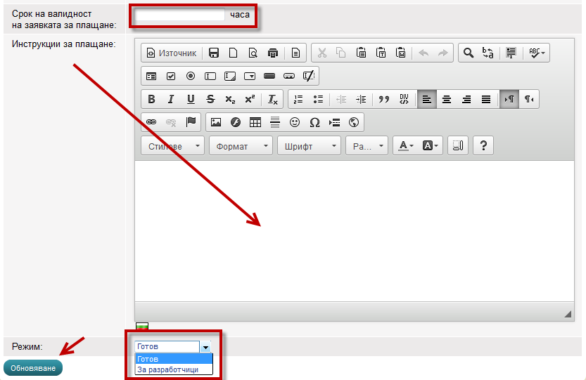Режим - Вариантите са или Готов или За разработчици. Първия се използва, ако всичко е наред с модула и могат да се осъществяват реални плащания. Вторият е за тестови режим.