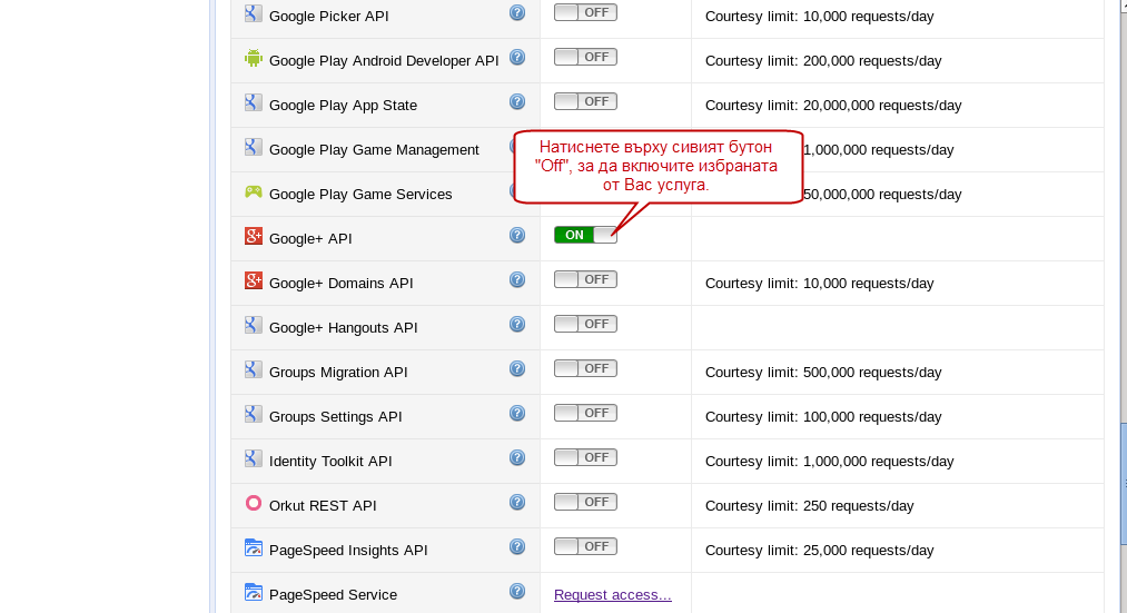 - След като създадете проекта Ви сайта на Google ще Ви пренасочи директно към "Services", като там трябва да активирате "Google+ API".