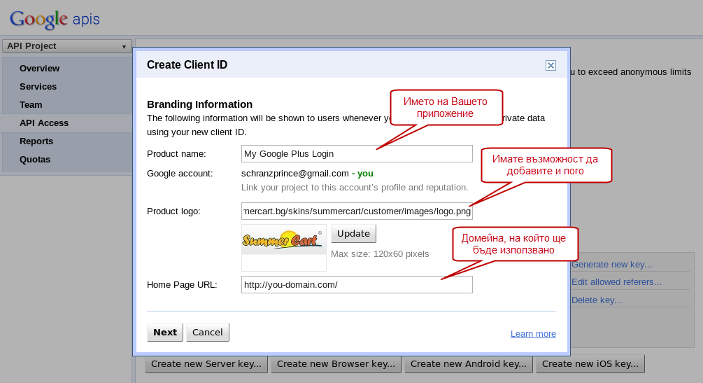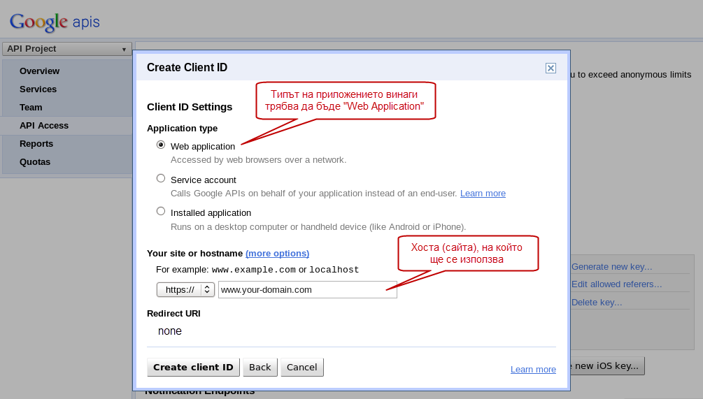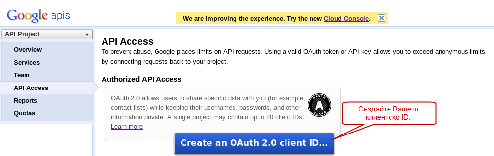 - След като активирате "Google+ API" от менюто влезте в "API Access" и натиснете бутона "Create an OAuth 2.0 client ID...", за да създадете Вашето клиентско ID.