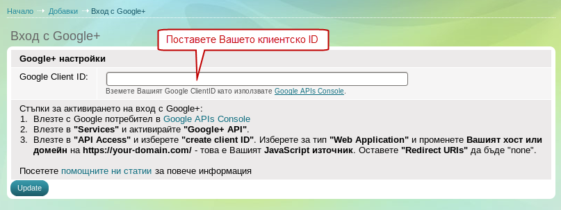За да добавите вход с Google+ в магазина Ви, трябва да имате инсталирана добавката "Google+", а също така и да изпълните следните стъпки:
