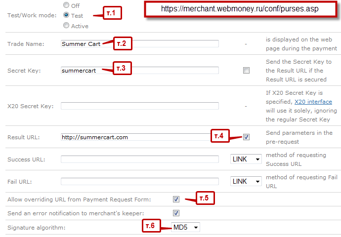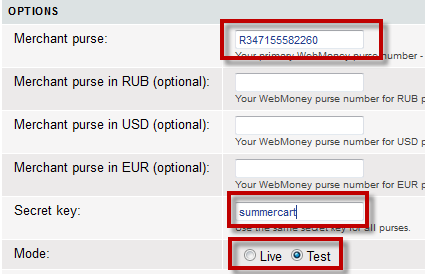 След като изпълните тези стъпки, се върнете в модула за плащане на Web Money в Summer Cart и въведете номера на т.нар. "purse", който може да видите най-горе при настройктие на "портфейла" в сайта на Web Money, като ще го познаете по това, че започва с главна буква, следвана от няколко цифри. След това въведете паролата, която сложихте в настройките в Web Money и изберете режима (test или active).