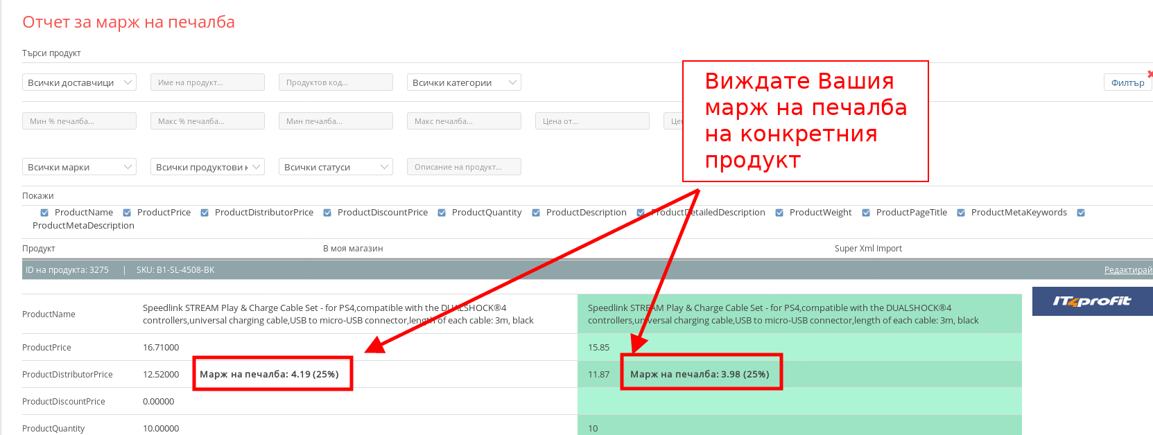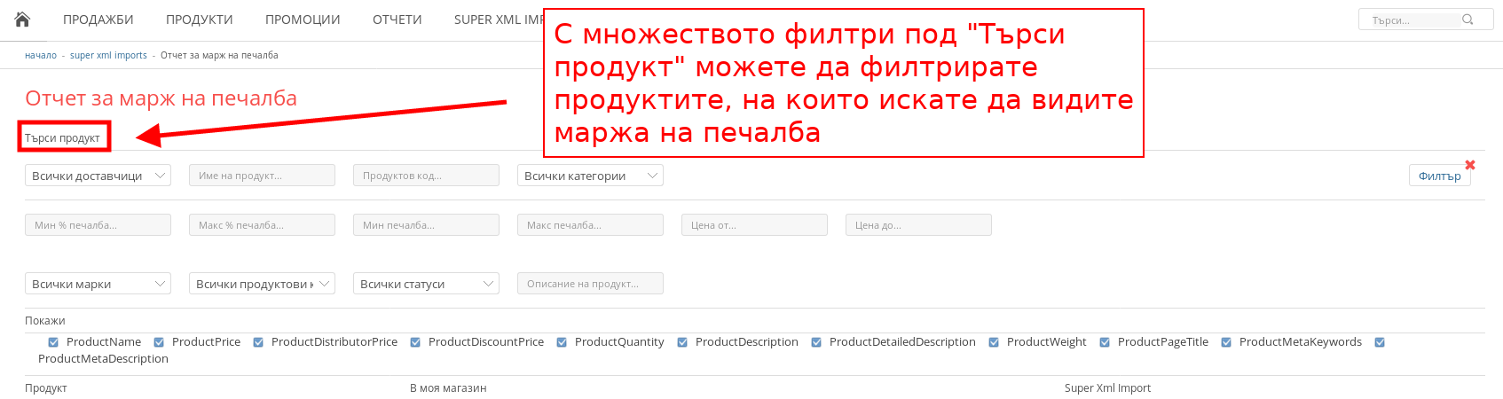 - С филтрите под “Търси продукт” можете да филтрирате на кои продукти искате да видите маржа на печалба. Можете да филтрирате кои доставчици да използвате, от кои категории да се взимат продукти, кои марки, продуктови варианти и статути на продуктите. Можете и да търсите продуктите по име, продуктов код, минимален % печалба и максимален % печалба, минимална печалба и максимална печалба като посочено число, цена от колко до колко и по описание на продукт.