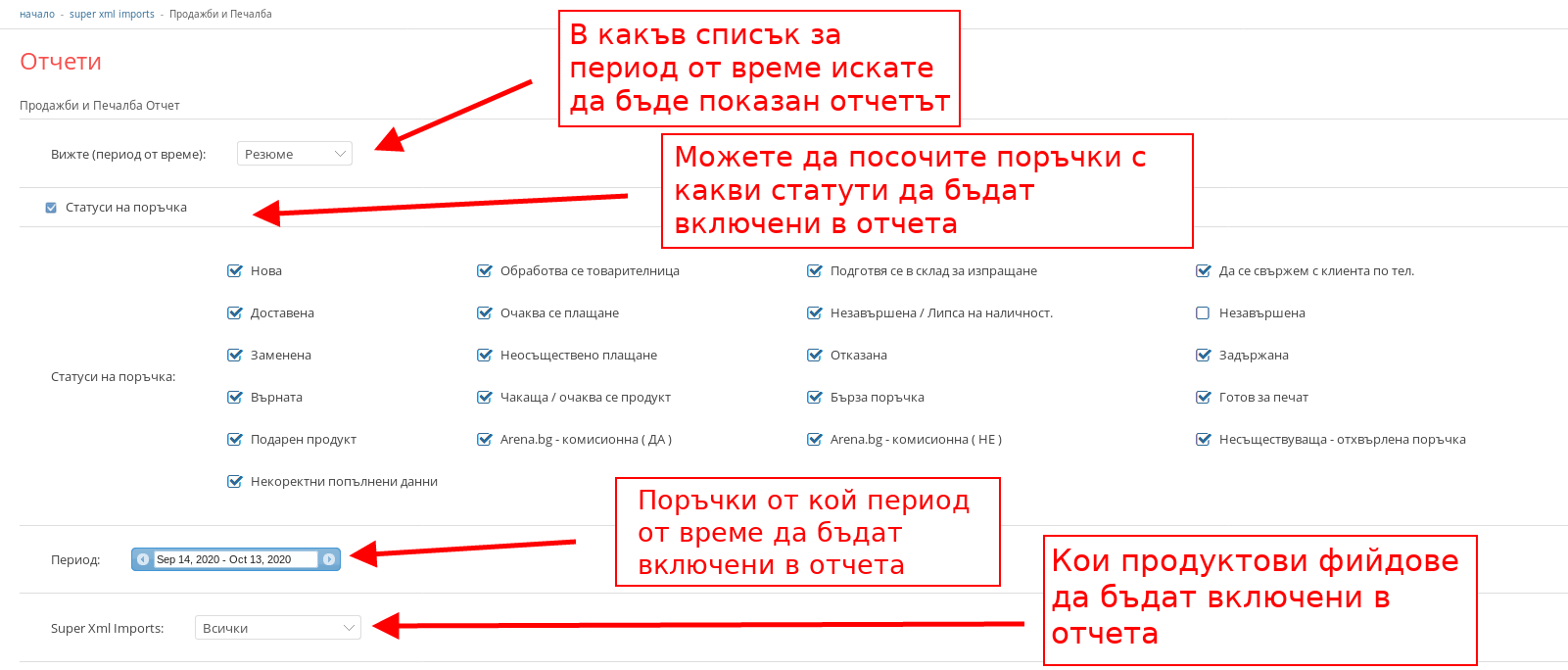 Ако сложите отметка на “Статуси за поръчка” можете да посочите продуктите в кои статуси да бъдат включени в отчета.