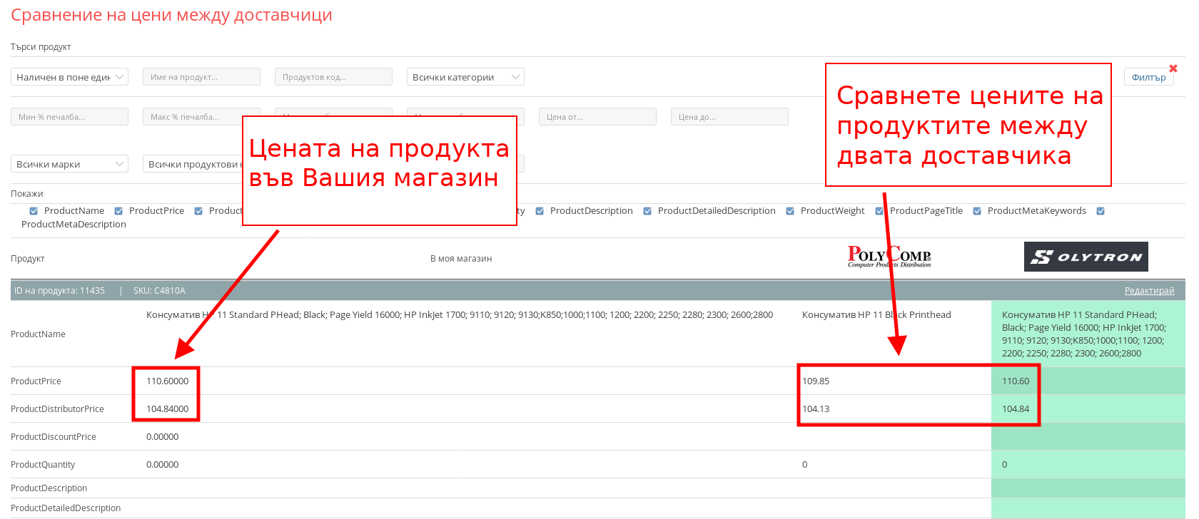 - С филтрите под “Търси продукт” можете да филтрирате на кои продукти искате да сравните цените на доставчиците. Можете да филтрирате какъв е минималният брой доставчици в които продуктът е наличен за да се визуализира в списъка, от кои категории да се взимат продукти, кои марки, продуктови класове и статути на продуктите. Можете и да търсите продуктите по име, продуктов код, минимален % печалба и максимален % печалба, минимална печалба и максимална печалба като посочено число, цена от колко до колко и по описание на продукт;
