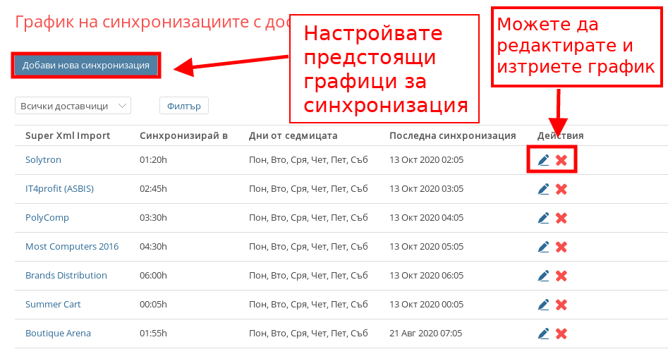 - В меню “График на синхронизациите с доставчици” можете да настройвате и управлявате предстоящи синхронизации:
