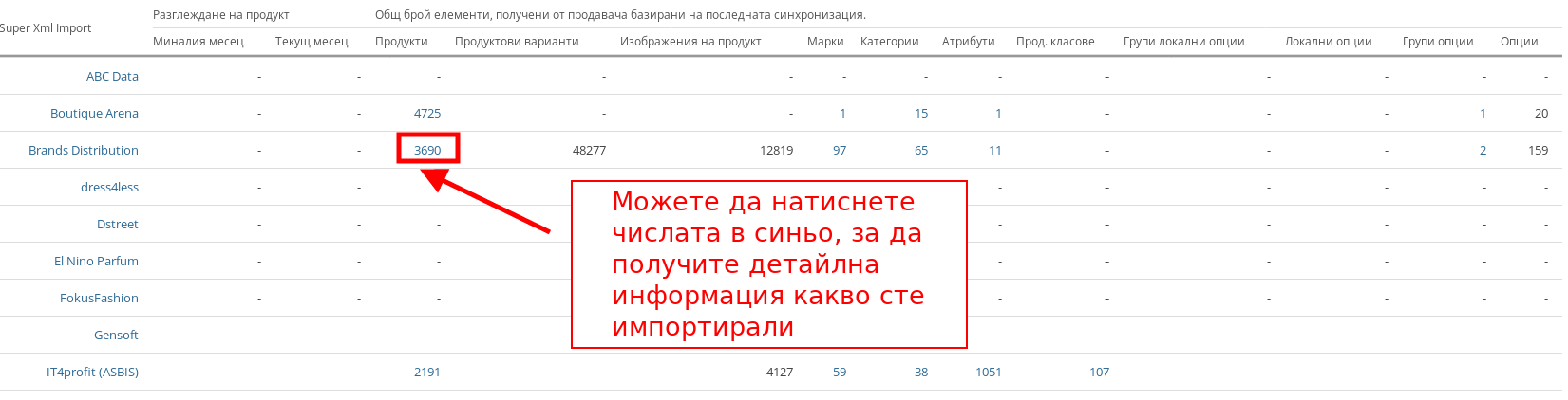 Числата, които са посочени в синьо могат да бъдат натиснати и да получите детайлен разбор за всички продукти, марки, категории, атрибути, продуктови класове или групи опции, които са били импортирани.