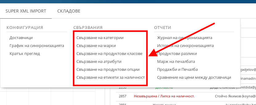 - В менютата под “Свързвания” управлявате по какъв начин се свързват импортираните категории, марки, продуктови класове, атрибути, продуктови опции и етикети за наличност с тези във Вашия онлайн магазин.