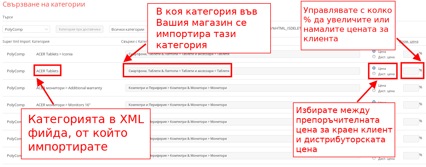 Пример: В XML фийда, от който импортирате има категория ACER Tablets, но във Вашия магазин имате категория Таблети. В “Свързване на категории” можете да настроите категория Acer Tablets от фийда, който импортирате автоматично да се налива в категория Таблети във Вашия магазин.