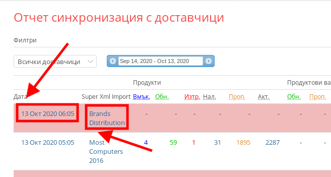 - В меню “Журнал на синхронизацията” виждате отчет за всички синхронизации на XML фийдове, които сте правили с доставчиците. Можете да филтрирате дали да виждате синхронизациите с всички доставчици или конкретен доставчик и можете да филтрирате от коя дата до коя дата да се показват синхронизациите.