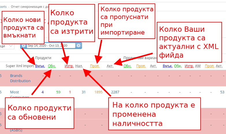 Посочени са и колко продукти са вмъкнати, колко са обновени, колко са изтрити, на колко продукти наличността е променена, колко продукти са пропуснати при обновяването заради настройките за "Защита от грешки" при импортиране и колко продукти са актуални, тоест еднакви с продуктовия фийд, от който наливате.