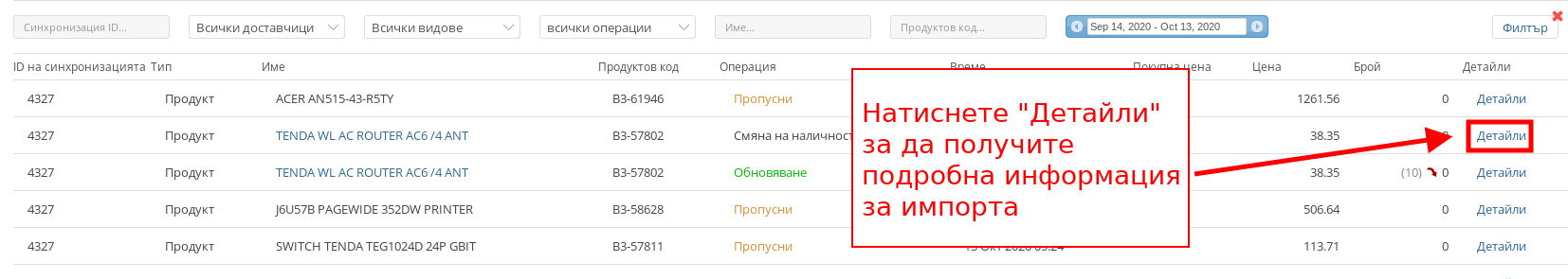 - Можете да сортирате импортираните данни по ID на синхронизацията, доставчици, вид на импорт (продукти, категории, атрибути и т.н.), каква е била операцията (вмъкване, изтриване и т.н.), име на продукти и продуктов код;