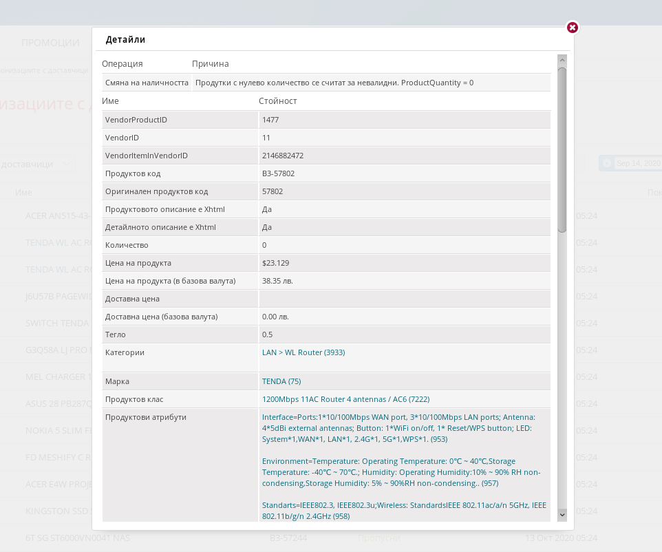 - В най-дясната част на реда на всеки импорт от XML фийда има бутон “Детайли”, с който ще Ви се отвори изскачащ прозорец, в който са посочени всички данни за импорта. В него можете да видите и защо операцията е била неуспешна или пропусната.