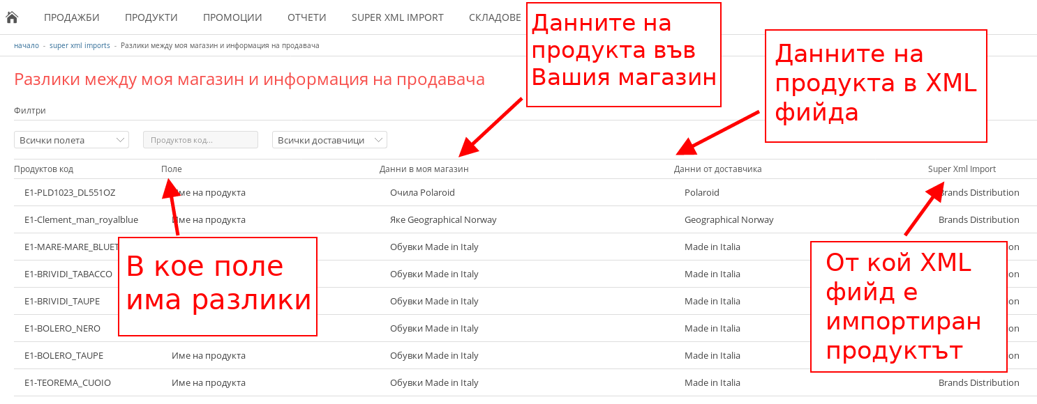- В меню “Продуктови разлики” можете да Видите какви са разликите между продуктите в XML фийда, от който импортирате и как продуктите изглеждат във Вашия магазин.