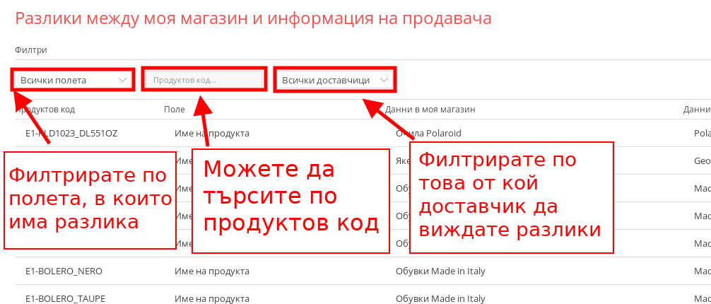 Можете да филтрирате по полета, в които има разлики: име на продукта, цена на продукта, доставна цена, цена с намаление, количество, описание, детайлно описание, тегло, заглавие на продуктовата страница, мета ключови думи и мета описание. Освен това можете да филтрирате по доставчици или да търсите по продуктов код.