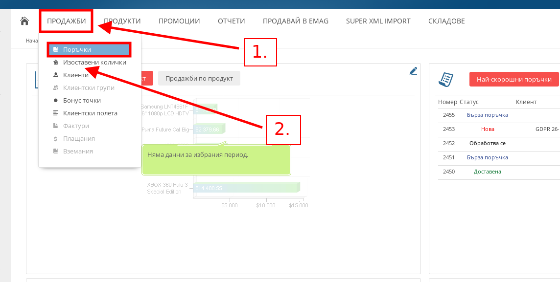 - За да отидете в списъка си с поръчки, трябва да посочите Продажби във Вашия административен панел и да натиснете върху меню “Поръчки”.