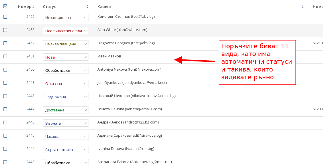- Обнови статуси – с този бутон задавате новите статуси, които сте избрали за отметнатите от вас поръчки;