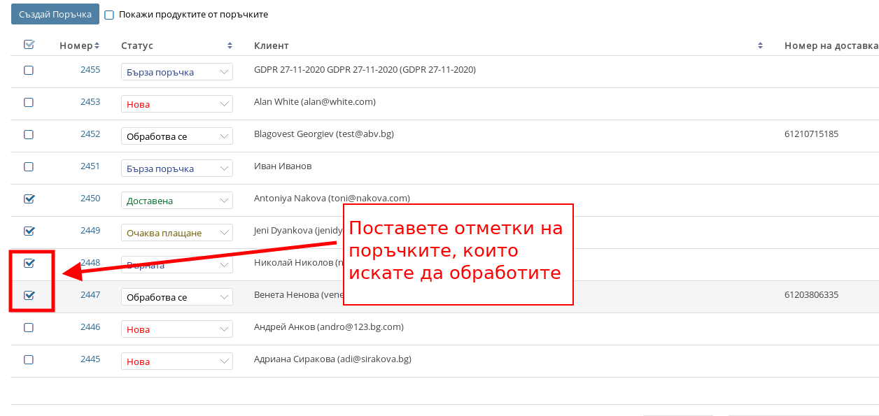 Можете да управлявате множество поръчки едновременно чрез бутоните за масово управление, използвайки отметки, с които да ги изберете.