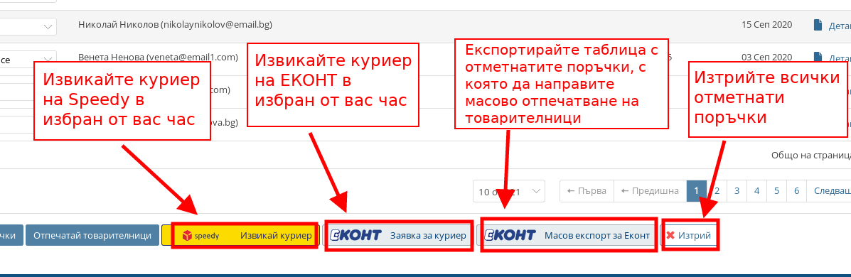 - ЕКОНТ Заявка за куриер – след като сте отпечатали товарителниците, с този бутон правите заявка за куриер на ЕКОНТ да дойде в избран от вас час за да изпратите поръчките си;