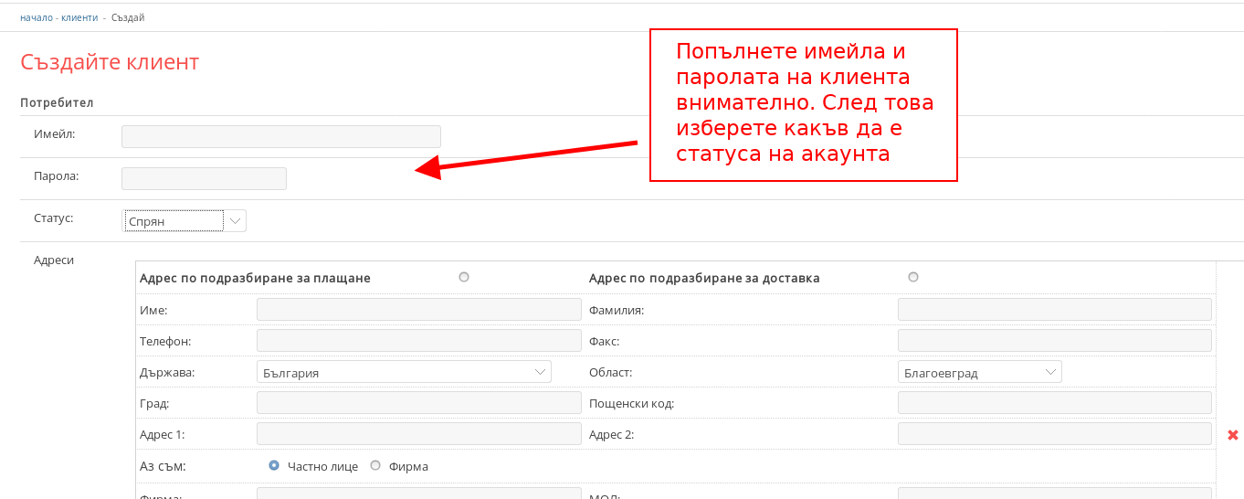 - Попълнете потребителските данни на клиента, като внимателно проверите имейла му и паролата му да са верни. От статус избирате какъв да е статусът на акаунта на клиента, като те биват: