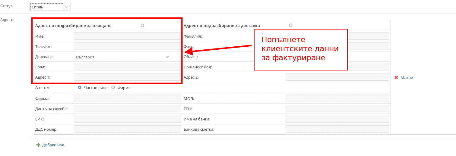 - Попълнете данните за адрес за фактура на клиента.