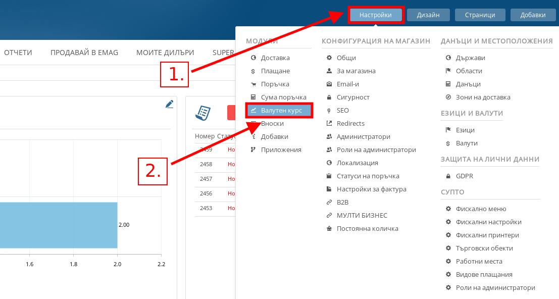 - За да отидете в списъка с модули за Валутни курсове в административния панел посочете Настройки и натиснете върху меню “Валутен курс”.