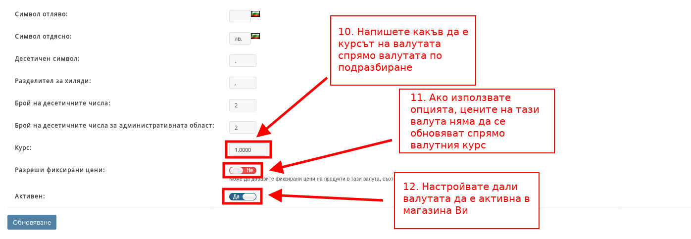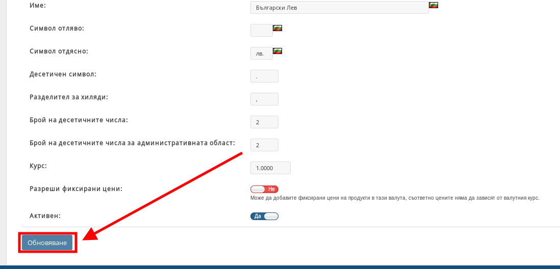 - С бутона “Активен” настройвате дали валутата да е активна във Вашия магазин.
