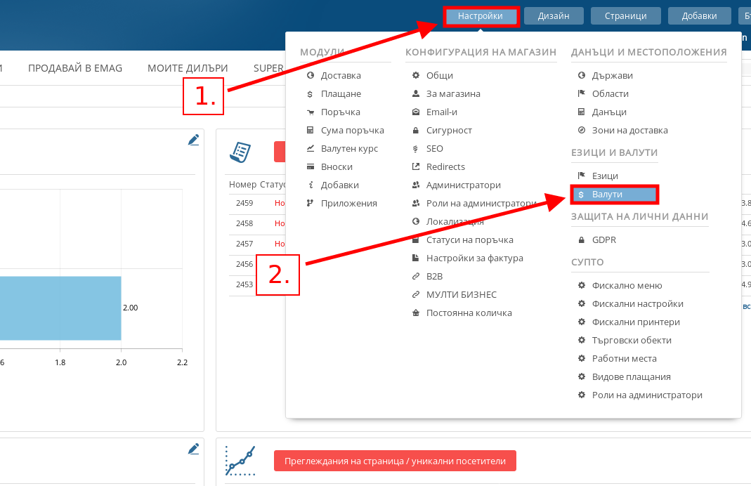- За да отидете в списъка си с валути, във Вашия административен панел посочете Настройки и натиснете върху меню “Валути”.