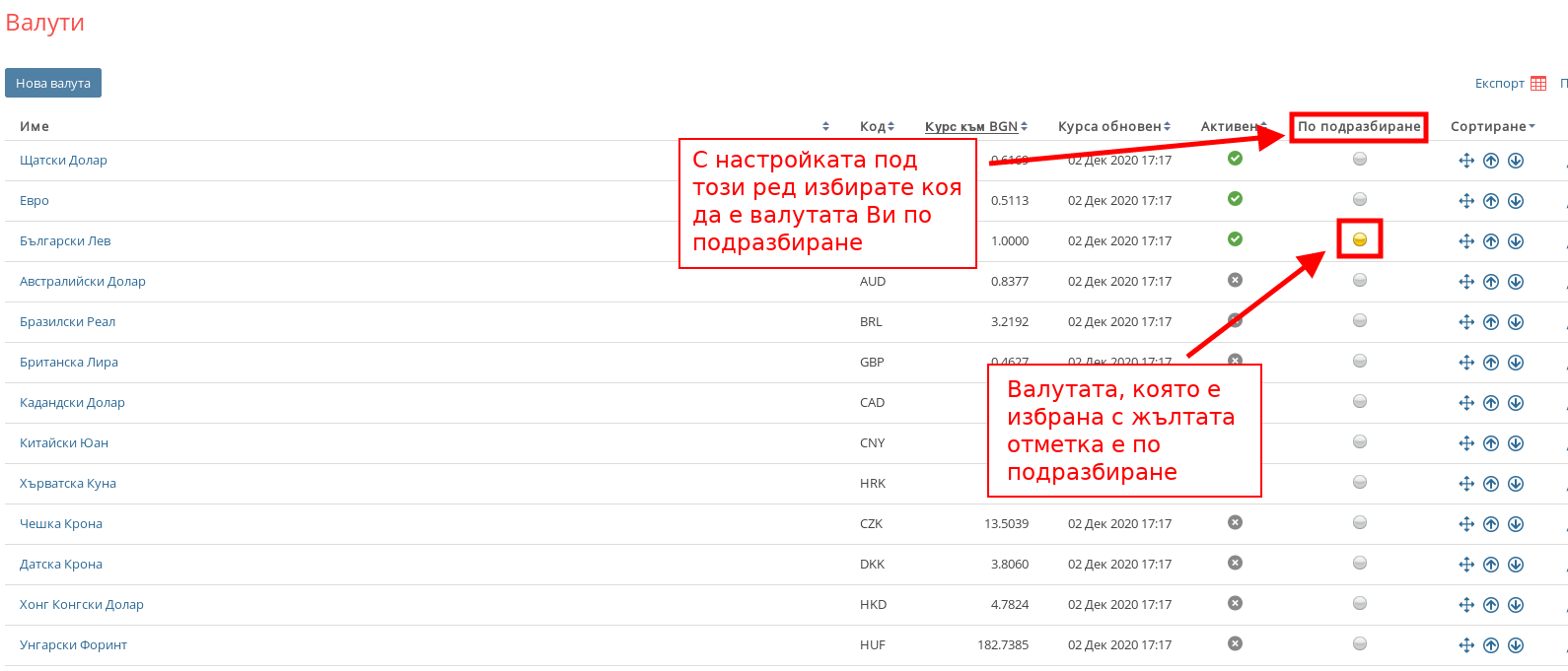- В списъка с валути има ред, който се казва “По подразбиране”. Валутата, която е избрана с жълта отметка