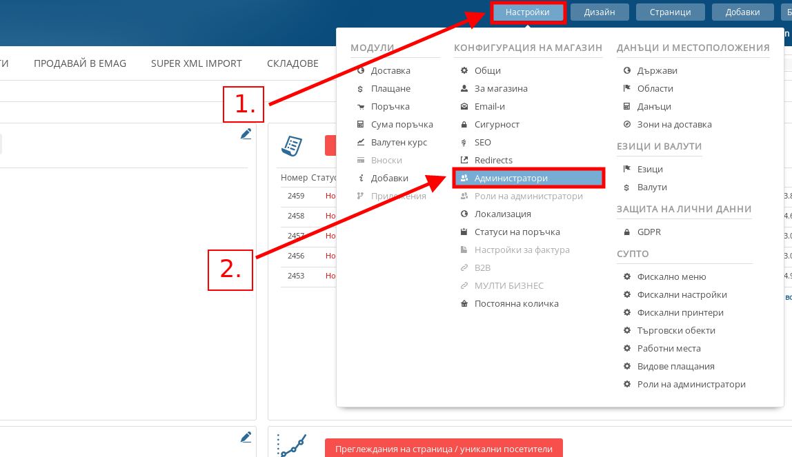 - За да отидете в списъка с административни профили, в административната област посочете Настройки и натиснете върху меню “Администратори”.