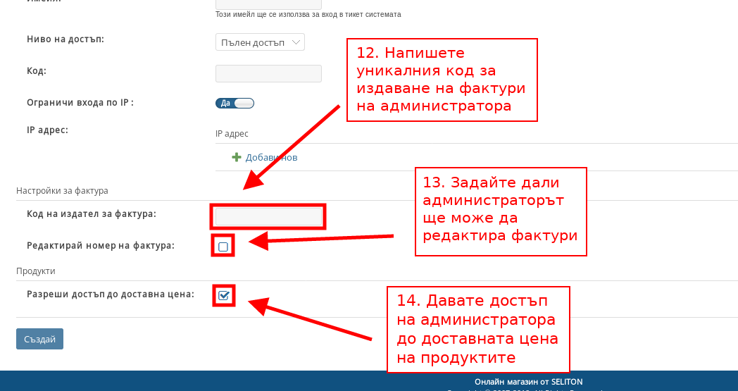 - В полето “Код” вписвате уникален код за администраторския профил, с който ще можете да проследявате всички промени по магазина, които е правил.