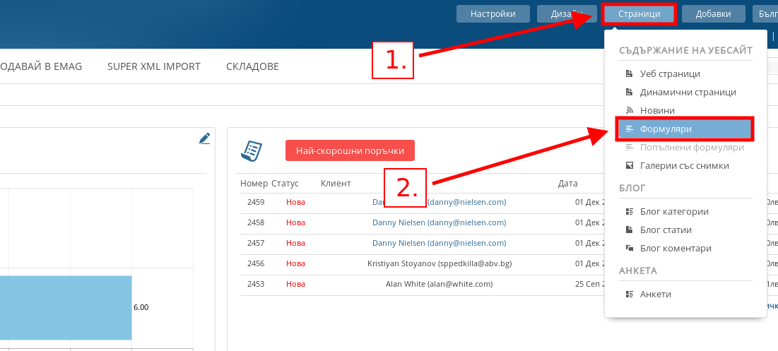 - За да създадете формуляр, във Вашия административен панел посочете Страници и натиснете меню “Формуляри”.