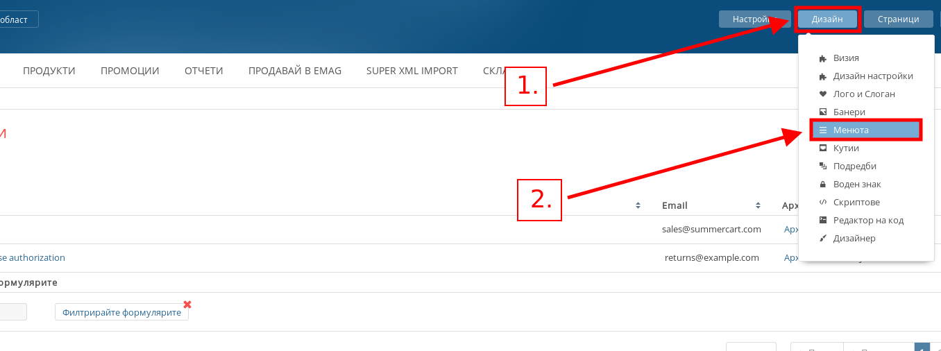 - За да добавите формуляра в магазина Ви, той трябва да е част от някое меню. За да отидете в менютата си, в административния си панел посочете Дизайн и натиснете меню “Менюта”.