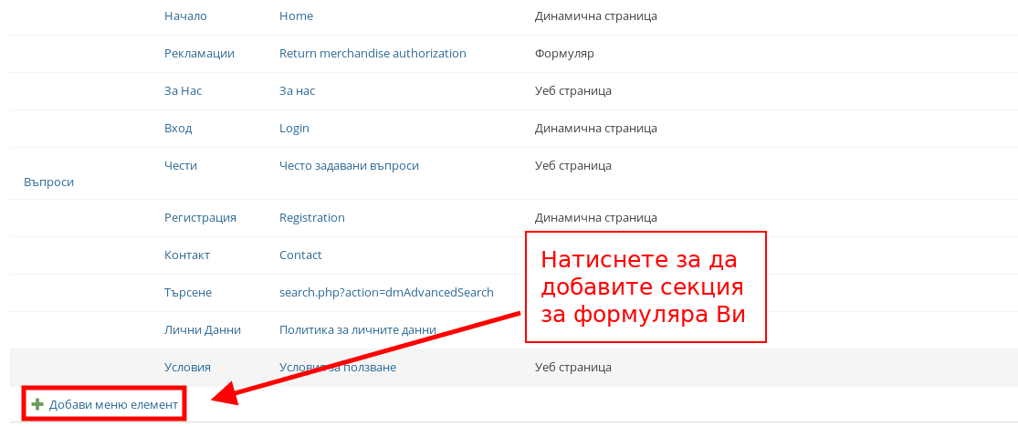 - За да добавите формуляра в менюто, натиснете бутона “Добави меню елемент”. Ако искате да прочетете повече за управление на менюта, можете да го направите в нашата статия за тях.