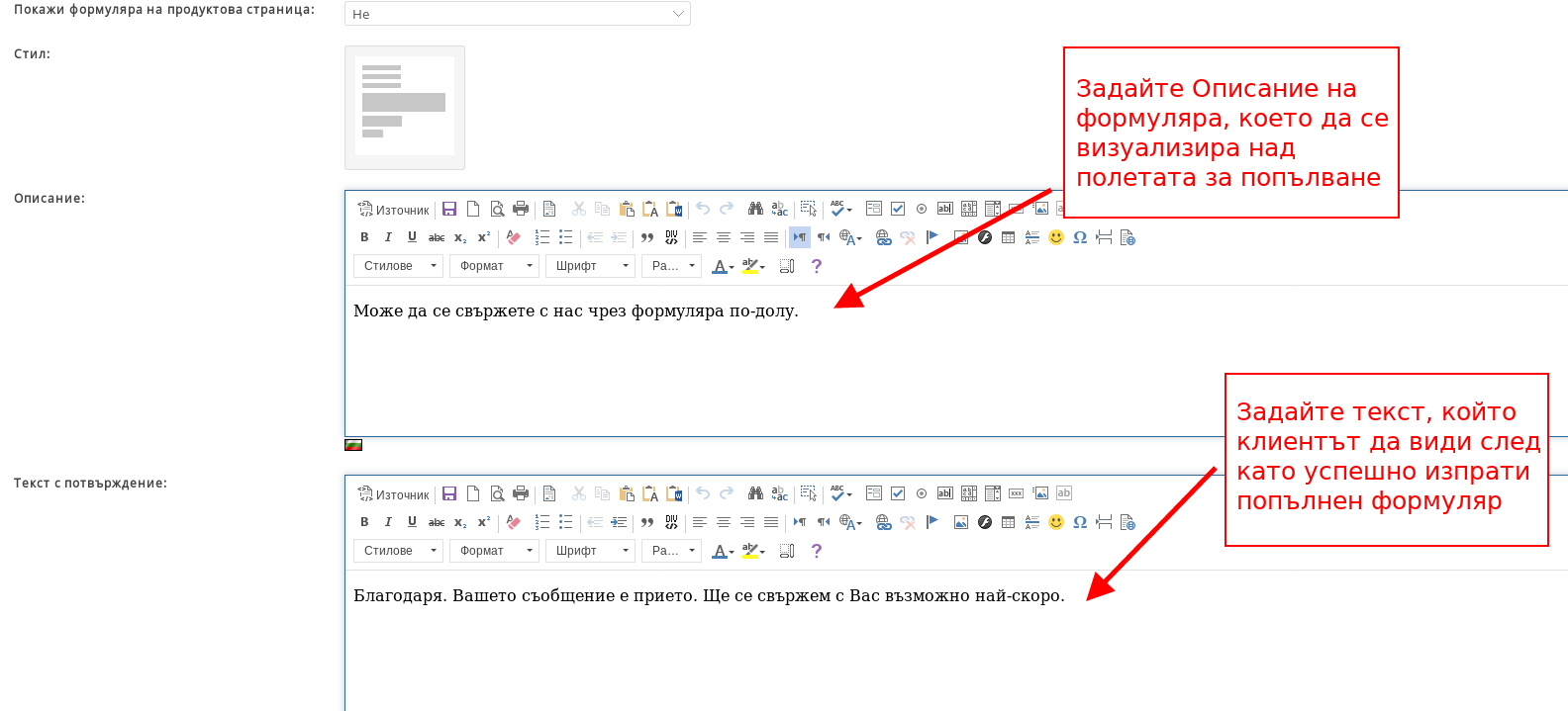 - В полето “Текст с потвърждение” задавате текст, който клиентът да види след като успешно изпрати запитване чрез формуляр.