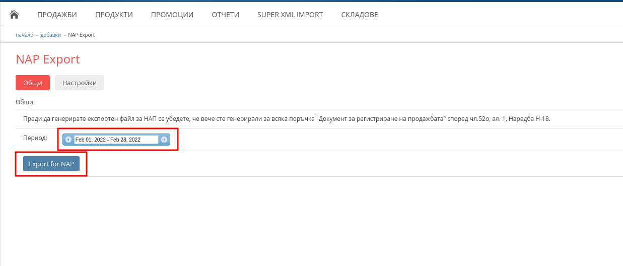 С помощта на добавката NAP Export може да генерирате XML файл с Вашите поръчки и да го качите в сайта на НАП.
