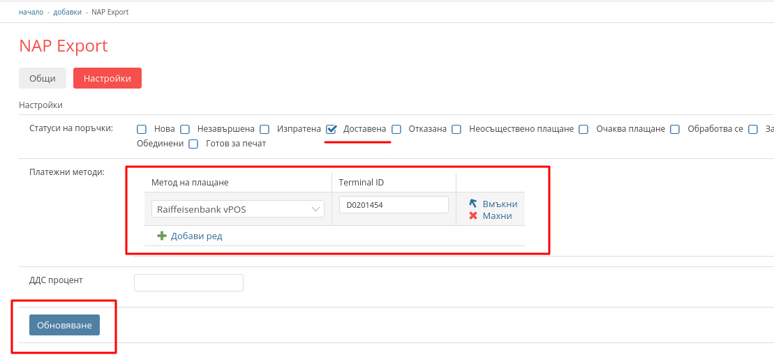 6. 2 В таб "Настройки" от секция "Платежни методи" изберете за кои платежни методи да се генерира експортен файл.