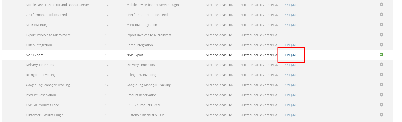 5. След като генерирате документ за регистриране на продажбата за всички поръчки, спрямо избраните филтри, отдете в главно меню "Добавки" и намерете добавката "NAP Export ". Натиснете на "Опции".