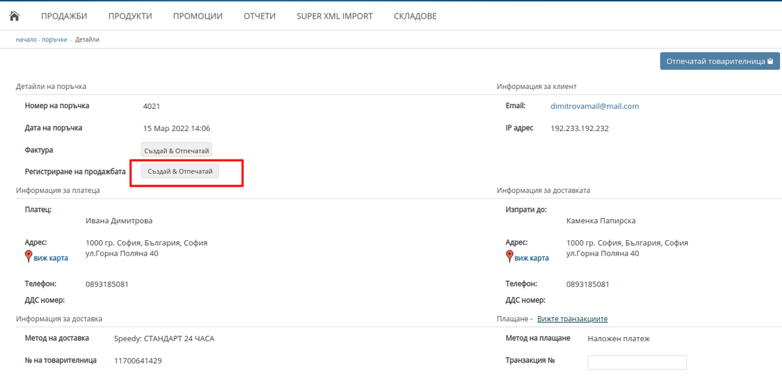 4. В страницата с детайлите на поръчката в секция "Регистриране на продажбата" натиснете на бутона "Създай & Отпечатай". Повторете тази операция и за останалите поръчки.