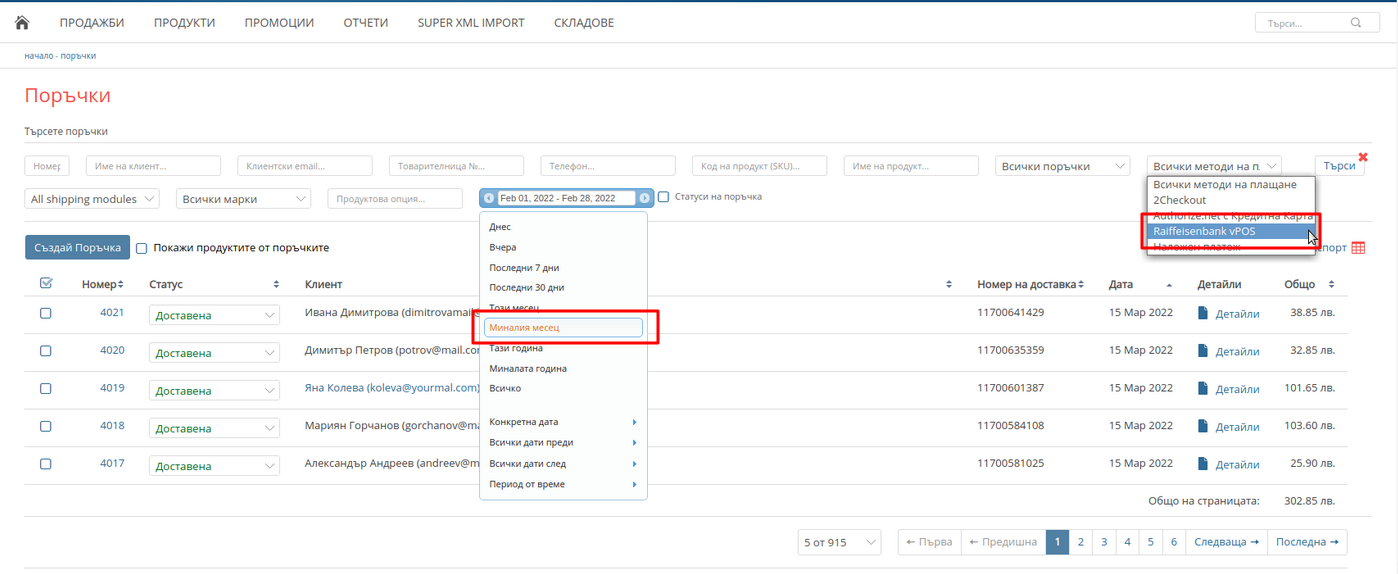 2. В страницата за поръчки от филтъра за дата изберете "Миналия месец". От падащото меню "Всички методи на плащане" изберете "Raiffeisenbank vPOS" и натиснете на бутона "Търси". По този начин ще филтрирате всички поръчки платени с модула на Райфайзен банк за избрания период.