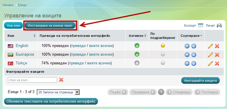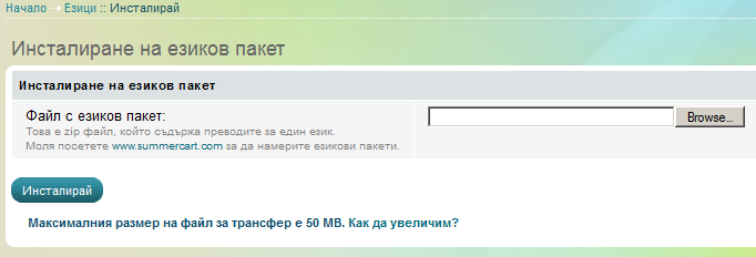След това кликнете на "Инсталиране на езиков пакет", качете .zip архива и натиснете "Инсталирай"