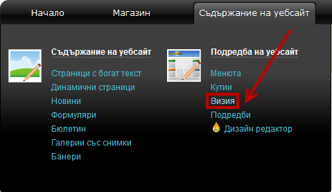 >> Отидете на меню 'Съдържание на уебсайт' и кликнете на линк Визии.