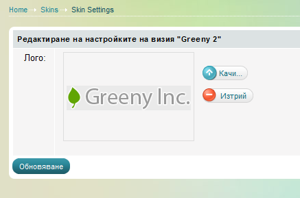 Изберете визия и натиснете "Активация" за да активирате визията. Ако изберете "Настройки" ще можете да въведете специфични настройки за визията, най-често това ще бъде качване на фирменото Ви лого.