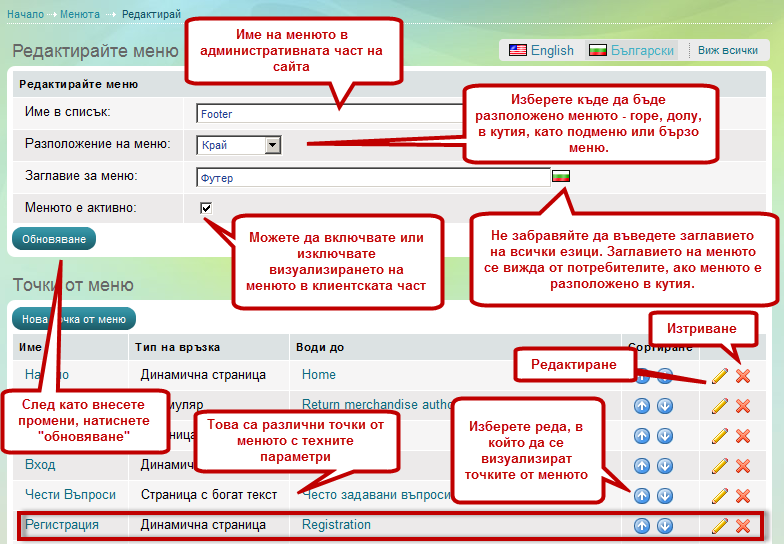 Промените в едно меню незабавно ще се отразят в уебсайта, при условие, че менюто има активен статус. |