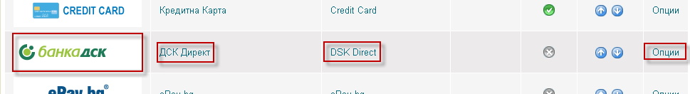 - Oт списъка с модули за плащане изберете ДСК Директ, като натиснете върху логото на ДСК Директ, самото име или върху Опции.