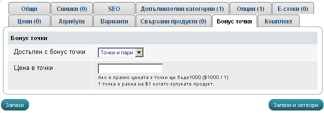 Цена в точки - можете ръчно да зададете колко точки струва продукта, ако оставите празно, цената ще се определя от стойността която сте въвели в общите настройки(т.10).